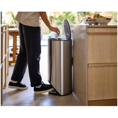 – Include două compartimente de 30 de litri pentru o sortare mai ușoară a deșeurilor și reciclării, plus un coș de 3 litri pentru deșeuri alimentare detașabil