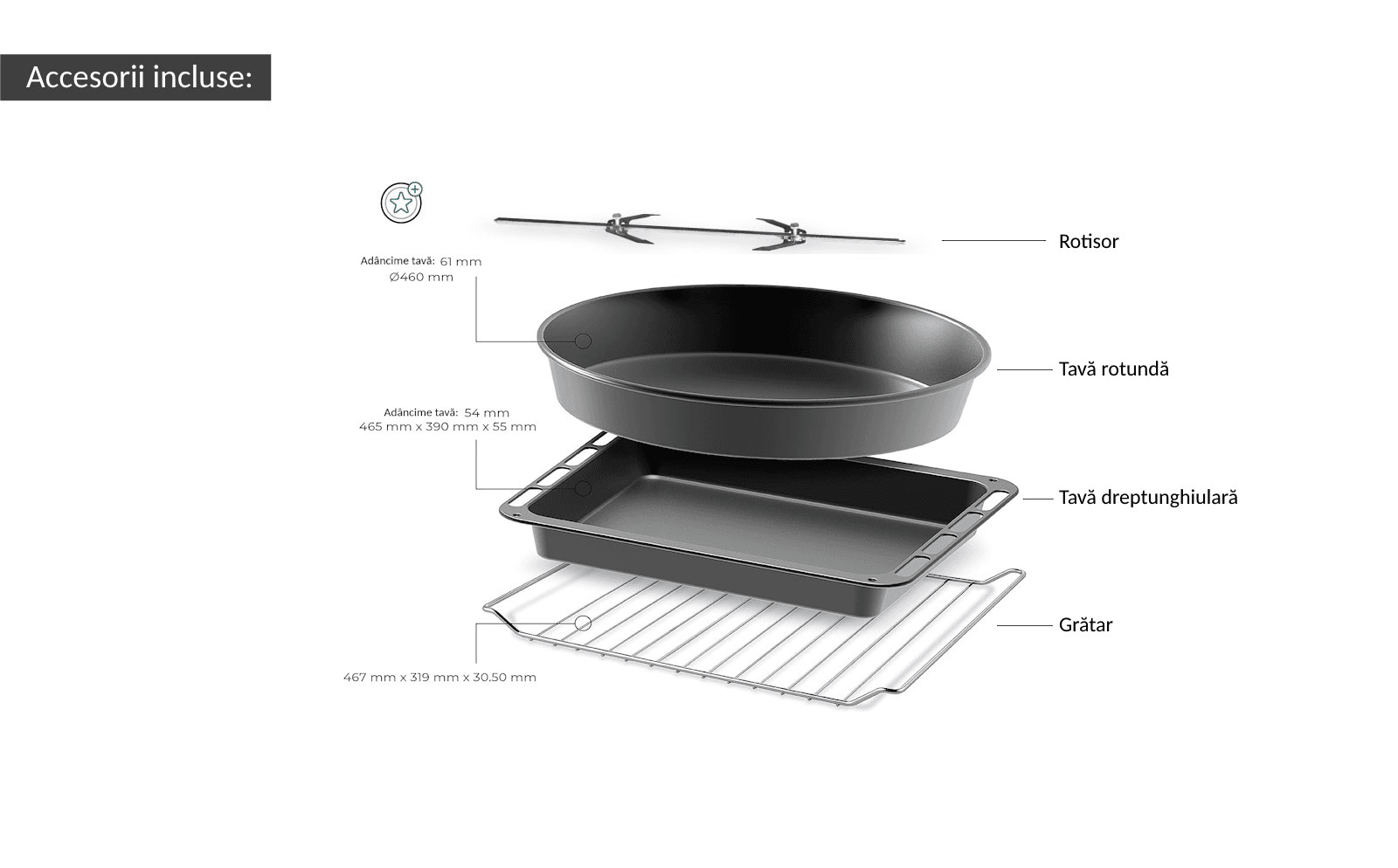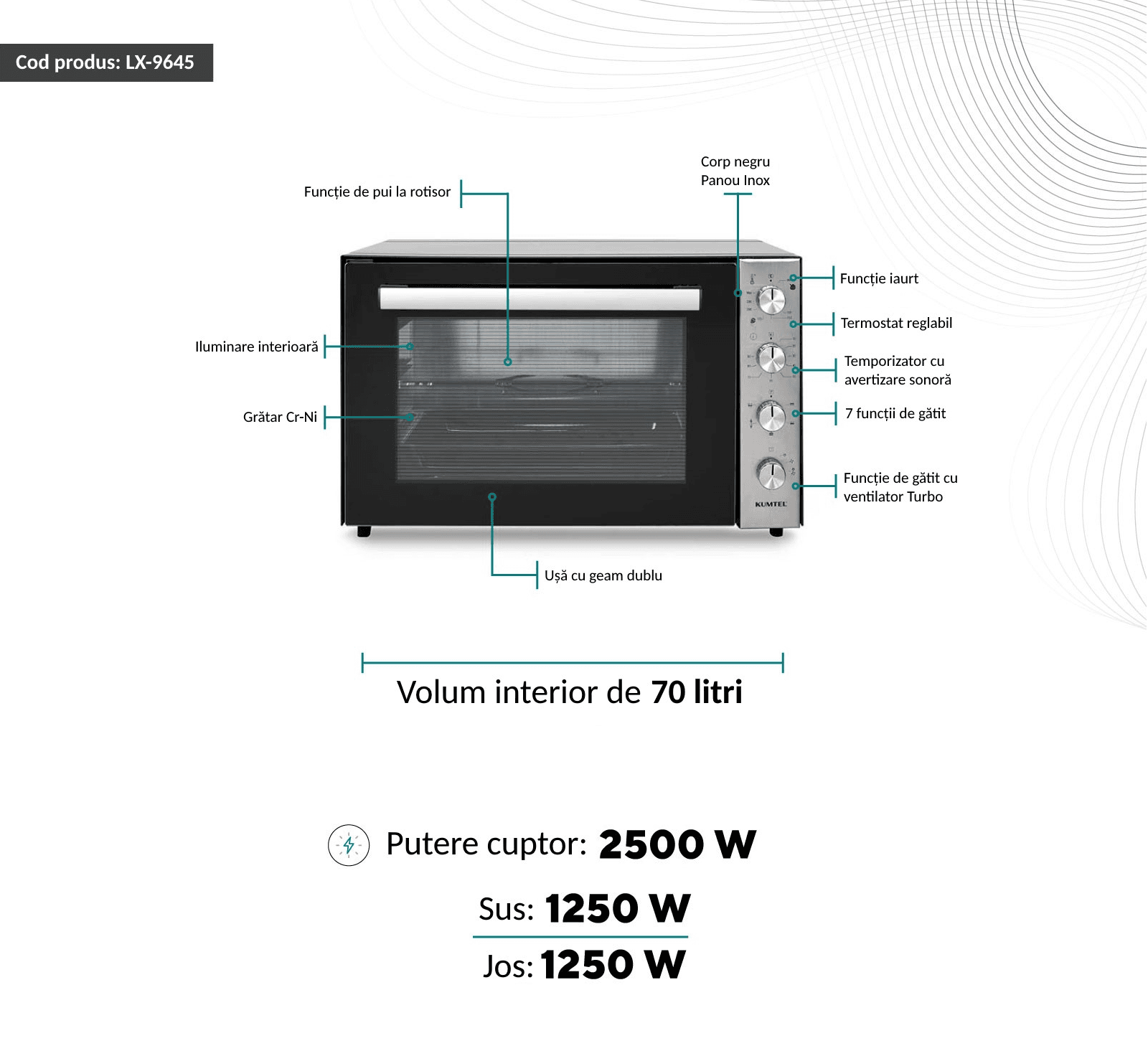 | Functii | 7 moduri de gatit, Convectie, Rotisor |