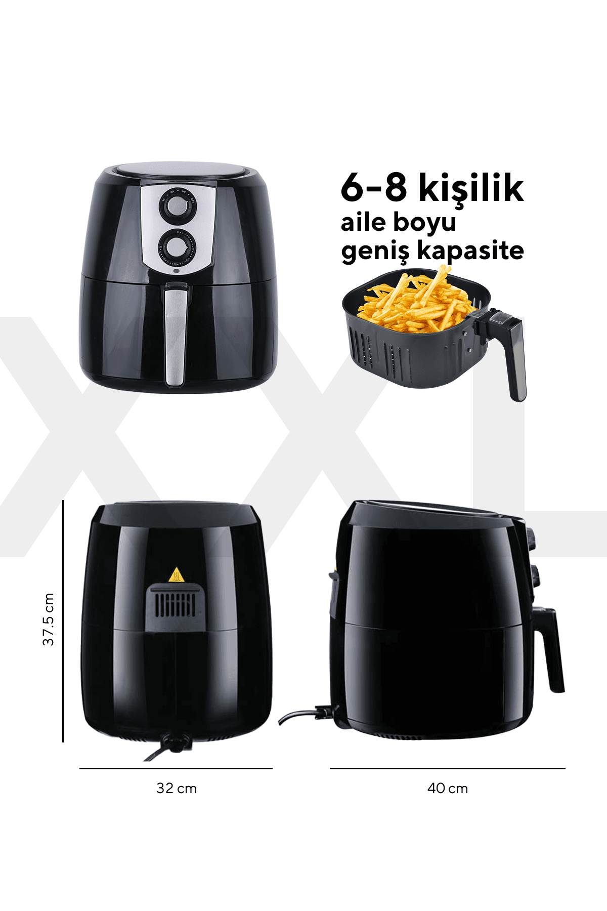 Ø  Dimensiune XXL pentru întreaga familie, având o capacitate totală de 8,5 litri, tigaie de 7,5 litri și coș de 5 litri.