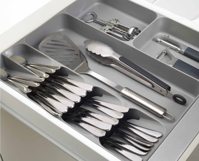 Organizator pentru tacâmuri cu design unic, maximizează spațiul în sertar. Compartimente suprapuse și mari pentru tacâmuri și ustensile. Potrivit pentru sertare de minim 8 cm înălțime.