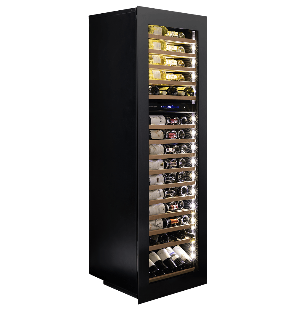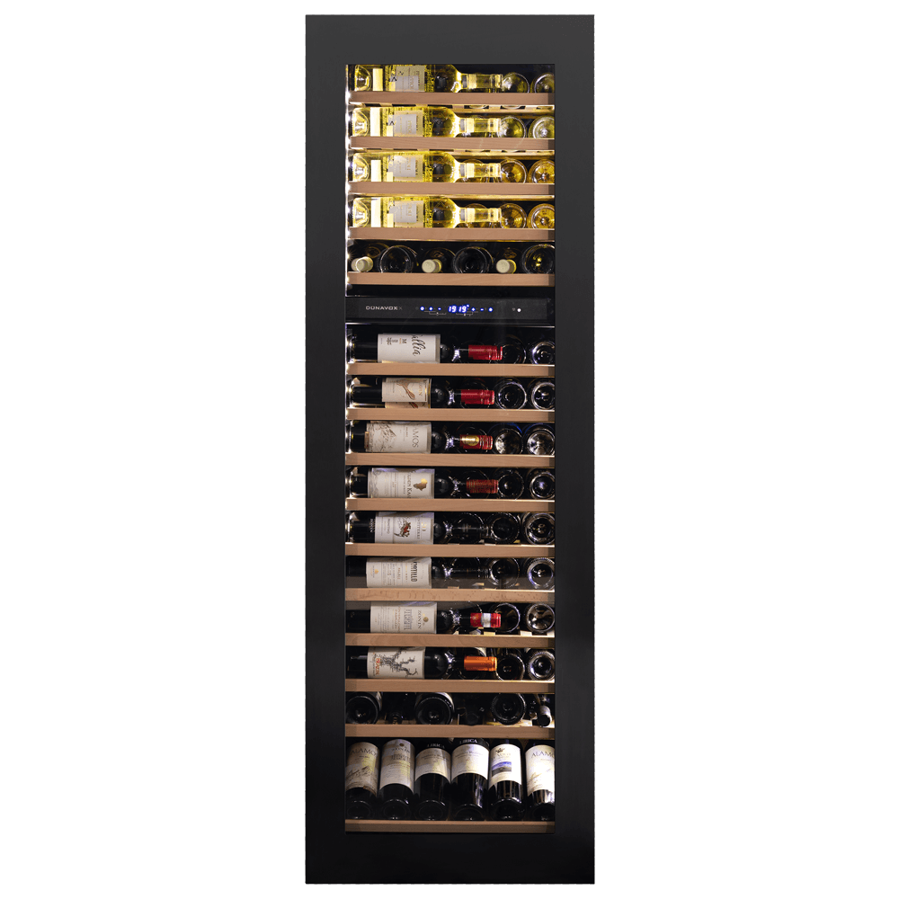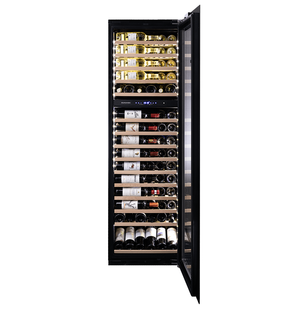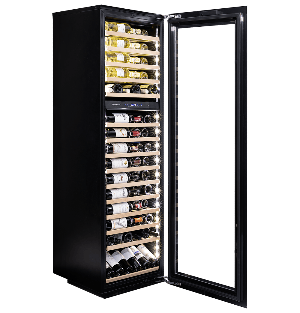 Unitate cu două zone de temperatură și sistem de răcire cu compresor din gama Dunavox GLANCE. Cu un aspect elegant și sistem de deschidere a ușii cu tehnologie push-to-open, se potrivește perfect într-o bucătărie modernă. Iluminarea interioară LED de culoare albă, portocalie sau albastră dă un plus de strălucire acestei unități. Capacitatea maximă este de 114 sticle de 0,75l format Bordeaux stocate pe rafturi din lemn de fag. Acest aparat este destinat a fi încorporat în mobilier și nu poate fi folosit de sine stătător.