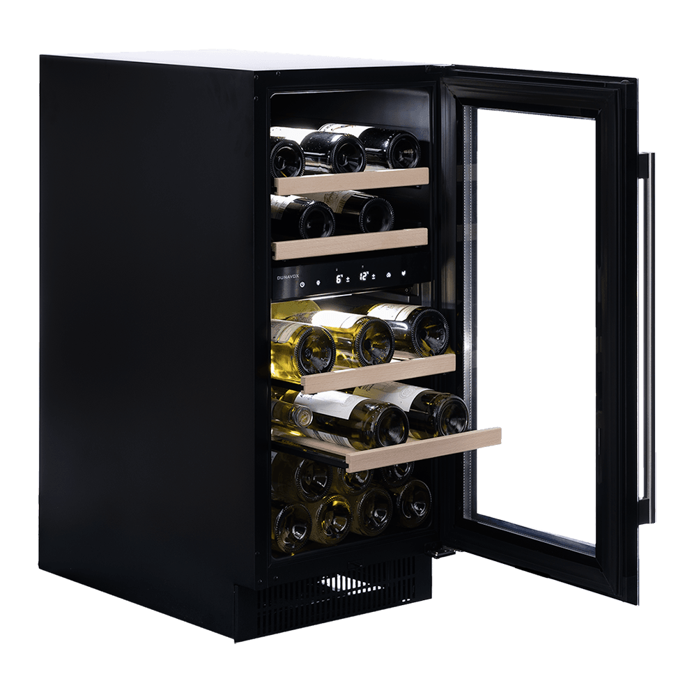 A dual temperature zone, 32 bottle undercounter model,?boasting an elegant exterior and a stainless steel door?handle. The DUNAVOX Flow-32D is perfect for contemporary kitchen environments. Bottles are supported on solid wooden?shelves and surrounded by white, amber?and blue interior LED lighting. The lower zone must be colder than the upper zone.?Please note?that this model is intended as a built in undercounter unit.