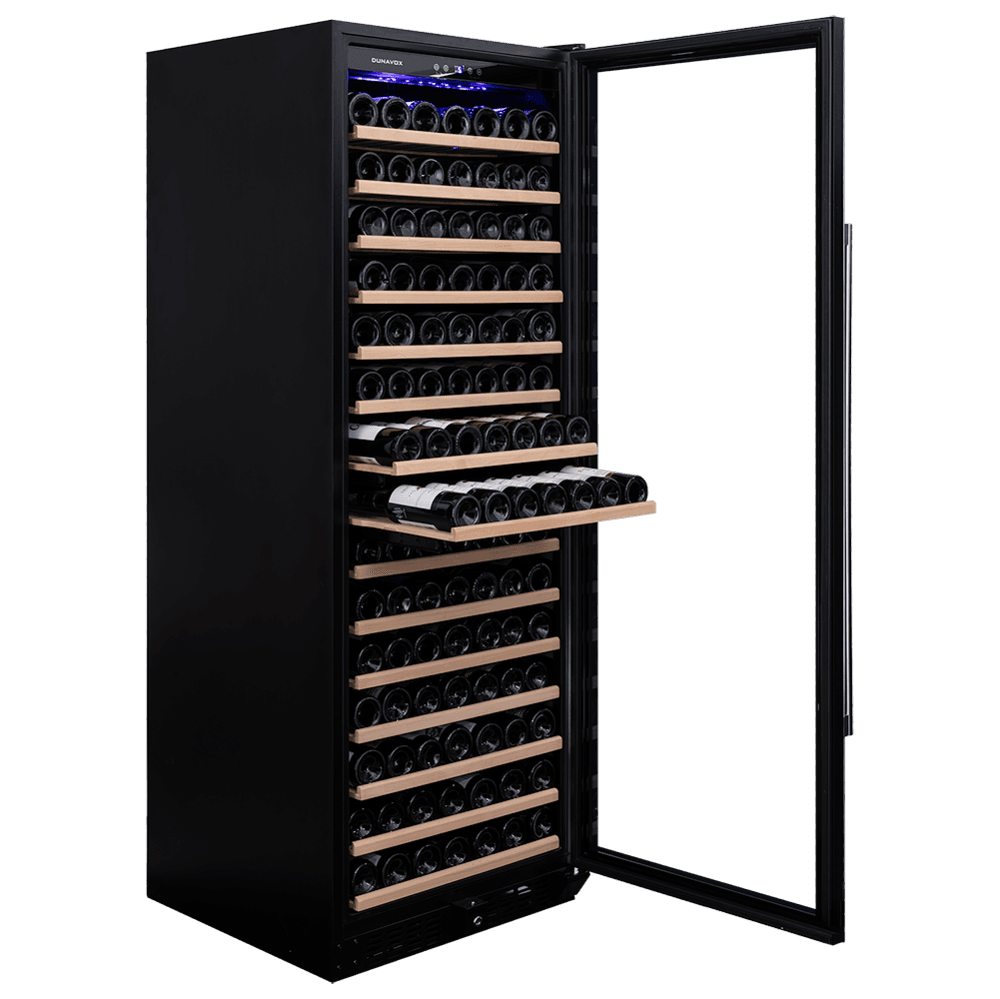 A single zone, 183?bottles freestanding model from?Dunavox?s Grande range. Boasting an elegant exterior.?The DUNAVOX Grande-194 is perfect for contemporary kitchens, hotels and restaurants. The bottles are supported on wooden?shelves set into a stunning light blue interior. Please note that this model is suitable for freestanding and built in use.