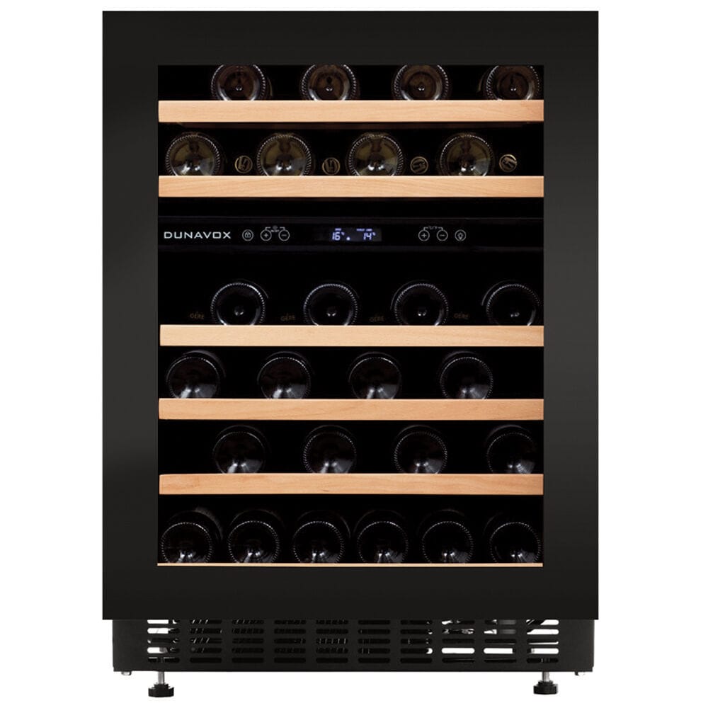 A dual zone, 46 bottle undercounter model. Boasting an elegant exterior and LCD display. The DUNAVOX Flow-46D is perfect for contemporary kitchen environments. Bottles are supported on telescopic rails and surrounded by white, amber and blue interior LED lighting. The top zone must be colder than the lower zone. Please note that this model is intended as a built in undercounter unit.
